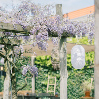 Als alle gasten, inclusief oma binnen zijn kan de ceremonie beginnen. Onder een prachtige paarse boog van blauwe regen komt de bruidegom binnen met zijn moeder. En de bruid met haar vader.