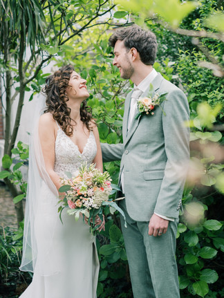 Het weer is een beetje wisselvallig vandaag. Maar precies tijdens de first look is het droog dus besluiten we dit lekker in de tuin te doen. De bruidegom krijgt nog even zijn broche opgespeld, de jurk wordt nog even goed neergelegd. En dan is het toch echt tijd om elkaar voor het eerst te zien!